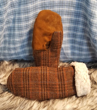 Blue and Brown Checker Mittens Lined with Faux Fur